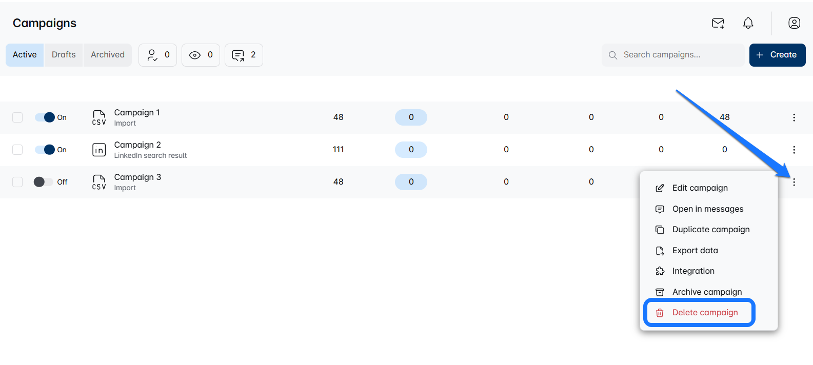 - Navigate to the Campaign dashboard and locate the campaign youโre looking to delete.