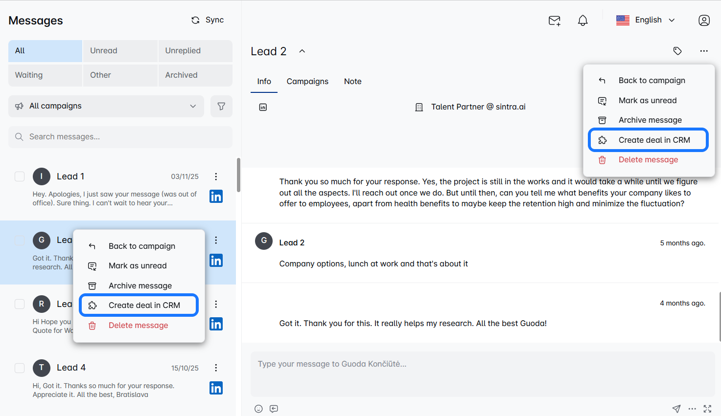 Once connected, you can start pushing leads and creating deals directly from the Messages page in LinkedIn Support Tool.
