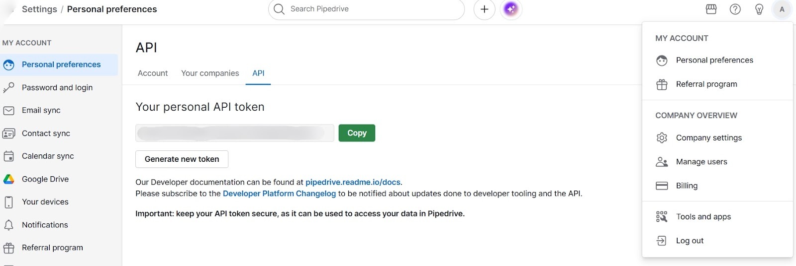 You can find your API token in Pipedrive by navigating to: