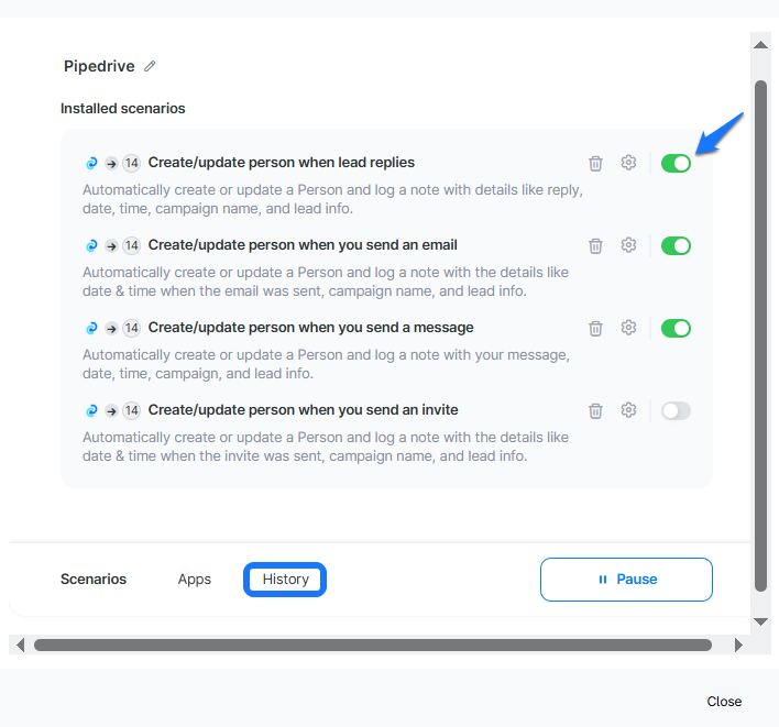 Logs sent emails as notes in Pipedrive with campaign and contact information.Create/update person when you send a LinkedIn message
